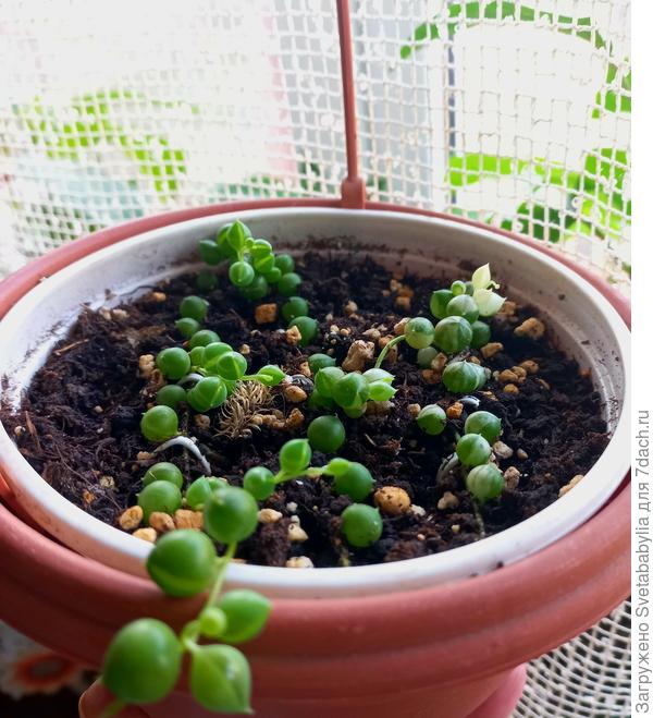 У меня это растение появилось всего год назад. Я приобрела укорененный черенок через Авито. Изучила всю необходимую информацию, как мне тогда казалось, пересадила в красивый подвесной горшок и стала ждать длинных ниспадающих плетей. Не дождалась. Уже потом поняла, что допустила ошибку, насыпав мало грунта в горшок. Получился достаточно высокий бортик, который мой цветок не смог осилить, даже нарастив достаточно большое количество зеленой массы. Пересаживать его я не рискнула, и решила оставить в качестве материнского растения, с которого до сих пор срезаю черенки для укоренения. Цветок на фото – это уже выращенный из черенков того самого первого цветка.