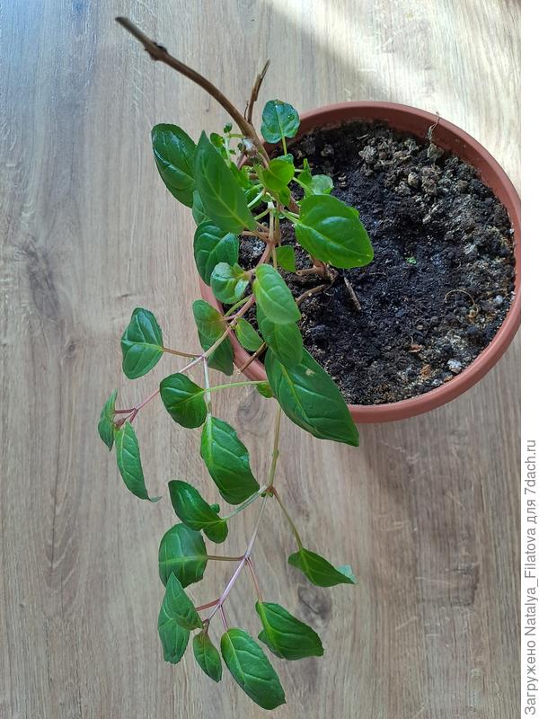 В конце лета горшок с фуксией упал на пол. После падения растение было пересажено в новое кашпо. Хотя рекомендуют ежегодную весеннюю пересадку, в этом году мы её пропустили. До сих пор видно, что верхушка стебля обломана, а зеленые веточки отходят от нижней части.