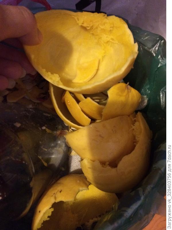 Тыква мускатная. Эту можно легко чистить ножам, ее кора кожистая, но разная по толщине. Есть тонкая, как у Витаминной и прикубанской, есть средняя, как у Виты.