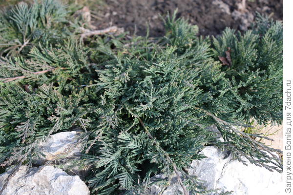 Блю карпет — чешуйчатый можжевельник, он неплохо нарастает, у него колючие иголки, и я бы не назвала его таким уж стелющимся, как, например, горизонтальные можжевельники. Для сравнения покажу своего Блю Карпет