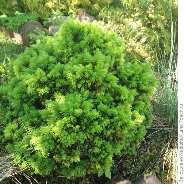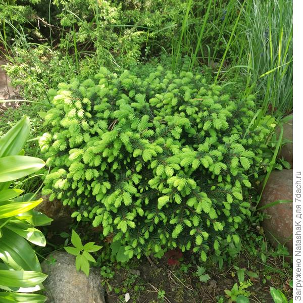Нарядный и стелющийся, в высоту не превышает 20 см, хвоя золотисто-зеленая. Бережно будет оберегать нашу розочку в морозные зимы.