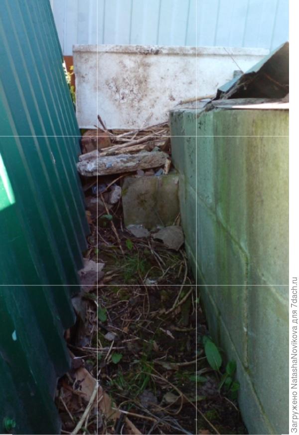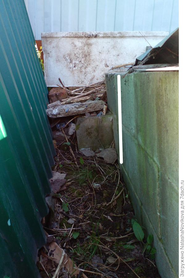 Вопрос снимаю, заложили прогал блоками и засыпали керамзитом с песком и глиной. Задняя сторона нашей сарайки обшита кровельным железом. Как я раньше не догадалась заглянуть за забор, сосед такой сосед