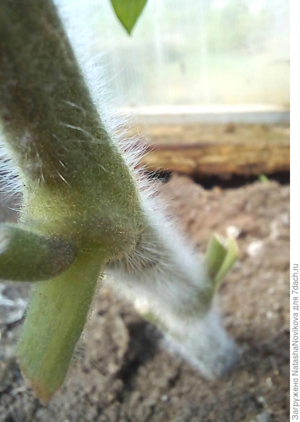 Уточню — пушок появился на вторые сутки после первого окучивания томатов, невысокого, но земля при окучивании была влажная и прохладная. Влажность пока высокая, теплицу не закрываю совсем, сквозняки есть.