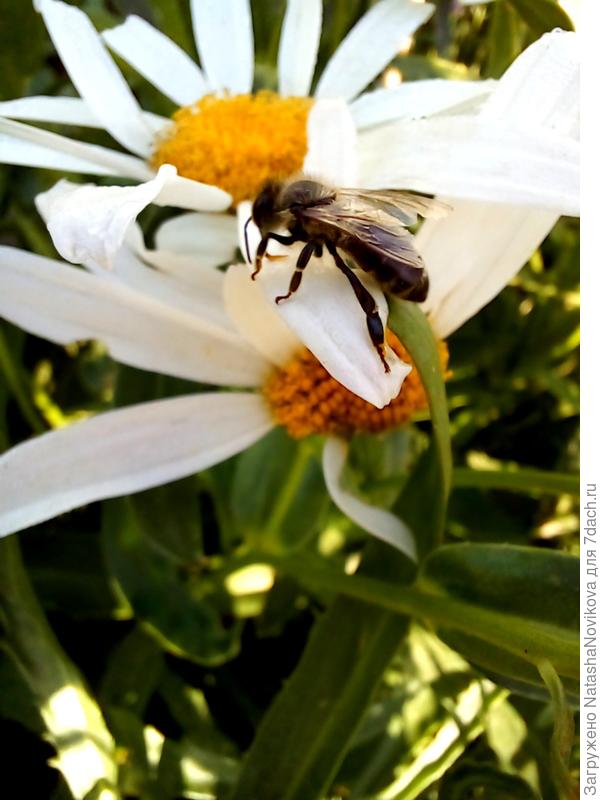 Запах у ромашки специфический, мне напоминает слабый запах полыни, может быть, поэтому вредители ромашку не атакуют, но пчёлки посещают цветочек.