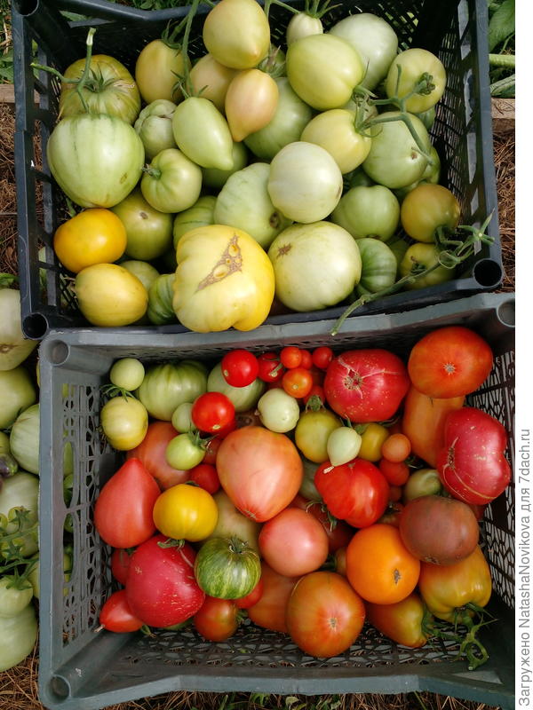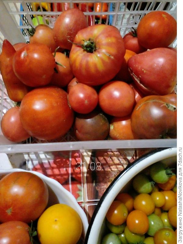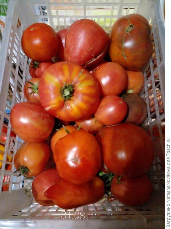 Нынче у меня с помидорами швах полнейший. Но на этих двух кустах более-менее помидоры были. Ящик набрала. Оставила семян на след.год. Самый первый помидор был весом больше 400г.