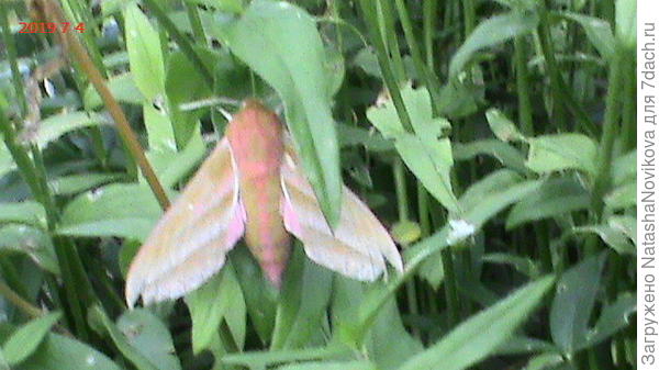я не успела обрезать флокс растопыренный, он уже отцвёл, а рядом с ним растёт хоста, наверное бражник запутался в дебрях флокса и принял его за травку, о которой пишет Вера,