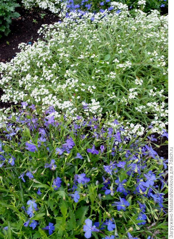 Лобелия на клумбе прекрасно сочетается с белым алиссумом. Цветки у лобелии 'Сапфир' ярко-синие с белым глазком.