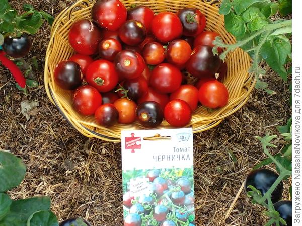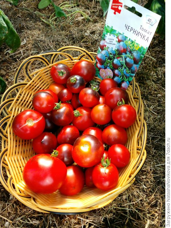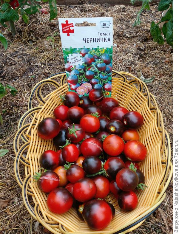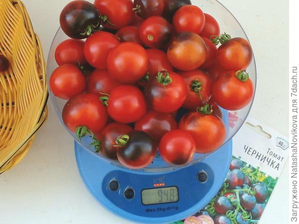 Первые плоды томата «Черничка» поспели 10 июля, через 55 дней после высадки рассады в теплицу и через 96 дней от посева семян на рассаду.