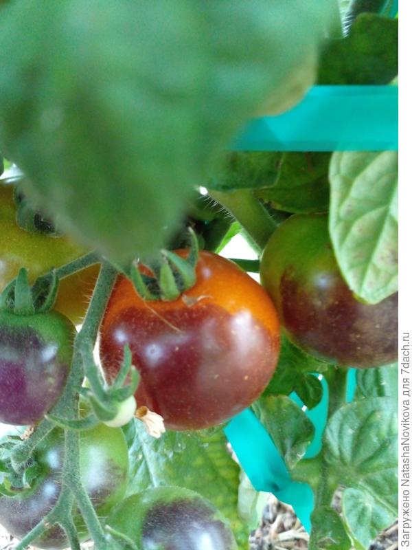 13 июня, через 28 дней после высадки томатов в теплицу, все кустики «Чернички» завязали плоды и начали приобретать антоциановую окраску.
