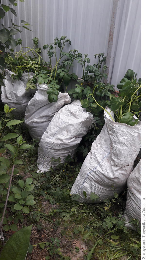 Нам только на сезон поесть, пока на даче живем, до ноября хватает. Прислонила к забору в укромном месте 14 мешков. В каждом по 3 картофелины. Вот и всё. Нынче даже земли не подсыпала, только поливала, потому что жара стоит бешенная. Уж не знаю, что вырастет в этом году, ботва подозрительно большая…