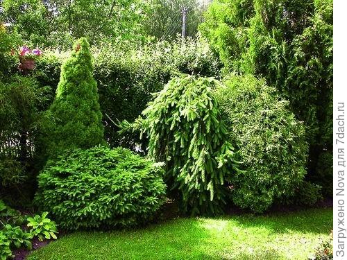 Любите барбарисы — замечательно, они могут стать отличным фоном и защитой от чужих глаз, к тому же прекрасно и обильно цветут и плодоносят, декоративны с весны до осени. Они довольно компактны в объеме и не съедят драгоценное пространство, если Вы выберите формы (сорта) с вертикально расположенными побегами. Иначе барбарисы придется регулярно стричь, чтобы ограничить их разрастание. Также для этой цели подойдут растущие в высоту кизильники. Несомненно, будет хороша моноизгородь из туи, или тиса. Подойти могут и другие листопадные кустарники, обычно используемые в создании живой изгороди — пузыреплодники, дёрены, или красивоцветущие — вейгелы, форзиции и т.д., но все они потребуют регулярной стрижки. Красивый серебристый фон для хвойных может создать Лох серебристый, если Вы сумеете ограничить его разрастание. Красив, изящен, душист (в цветении), но очень агрессивен.