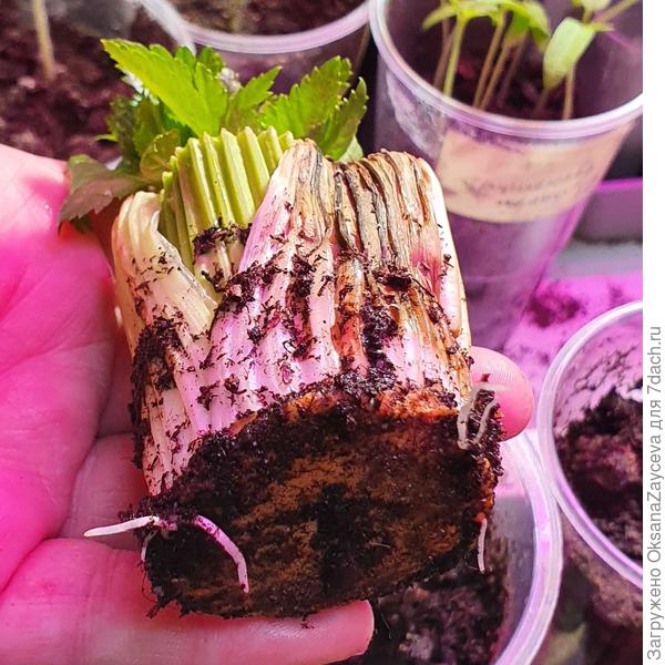 А все неинтересное, что осталось на пяточке, сажаем в стаканчик! Желательно в прозрачный и хотя бы 300 мл. Черешковый сельдерей очень быстро пускает корни и имеет очень большую и развитую корневую!