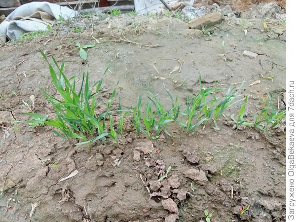 Первой из-под земли пробилась рожь. Я сажаю ее ради колосков на букеты. Несколько лет назад соседи по даче засеяли рожью весь участок, а скосили не везде. На границе она с тех пор и растет, срезала несколько колосков, свесившихся за рабицу, в прошлом году.