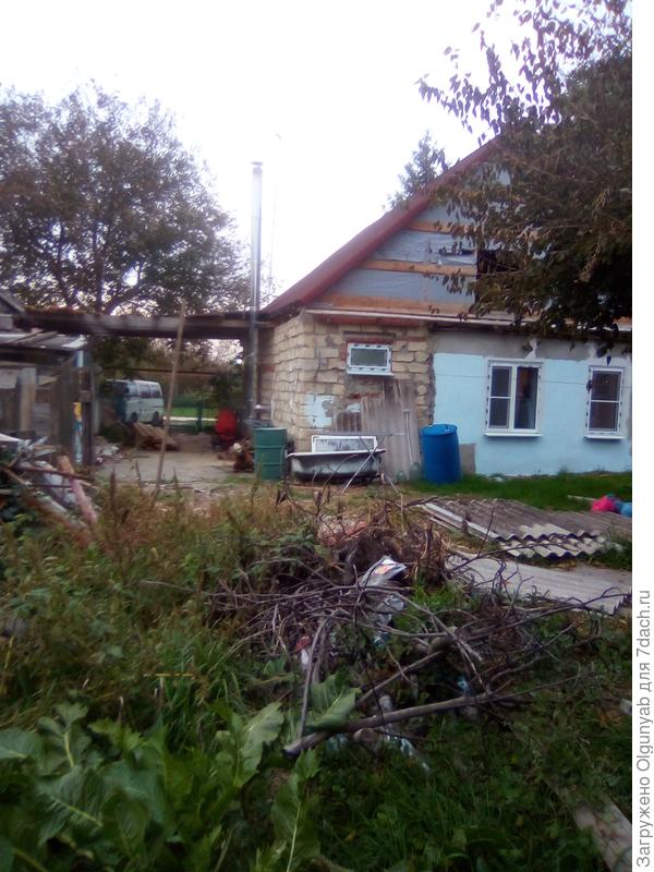 Прилагаю фото. Эту территорию предстоит обустроить. орех перед домом останется. Участок зарос кустарником и дикой алчой будет расчищатся. Септик находится напротив сарая под шифером. Справа от него уличный туалет который тоже останется.