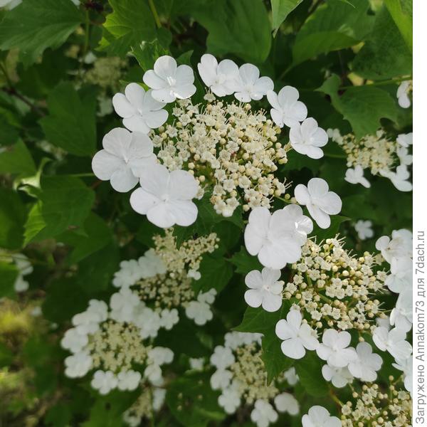 Более менее к более крупным соцветиям можно отнести сорт калины обыкновенной Ноткан'с Вэраети (Viburnum opulus Notcutt' s Variety).