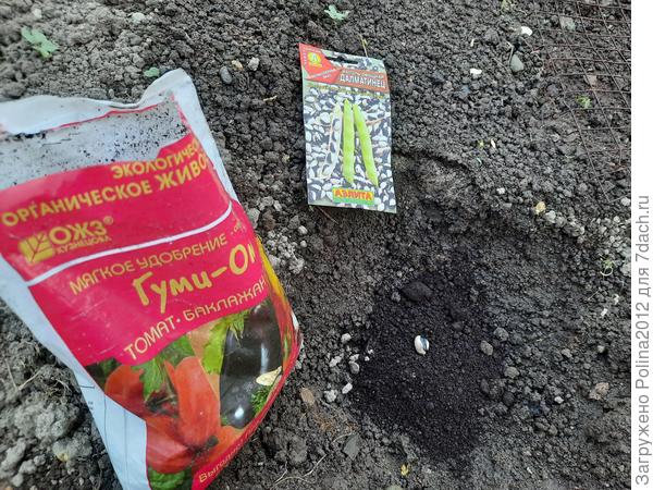 День посадки — 8 мая. В пачке оказалось 7 целых и 1 разломанное зерно. Вечером 7 мая замочила семена в воде. Утром 8 мая посадила набухшие семена. Сделала лунки, на дно насыпала по одной горсти удобрения Гуми-оми. Разложила фасоль и присыпала землей. Надо сказать, что я сею фасоль всегда сухими семенами и всегда в открытый грунт.
