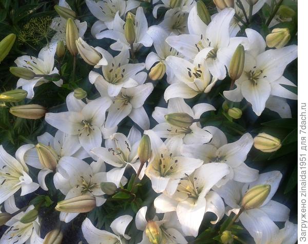 Теперь встала задача — найти подходящих спутников для белого цветка идеальной формы. Кстати, тогда я и озадачилась поиском названия сорта своей красотки. По всему было понятно, что это азиатская лилия — цветок некрупный, аромата не имеет, но оооочень неприхотлива, раз жила у меня в тени дерева и цвела! С помощью интернета удалось идентифицировать мою красотку, как лилию Аполло. Это имя ей прекрасно подходило — настоящий идеал красоты!
