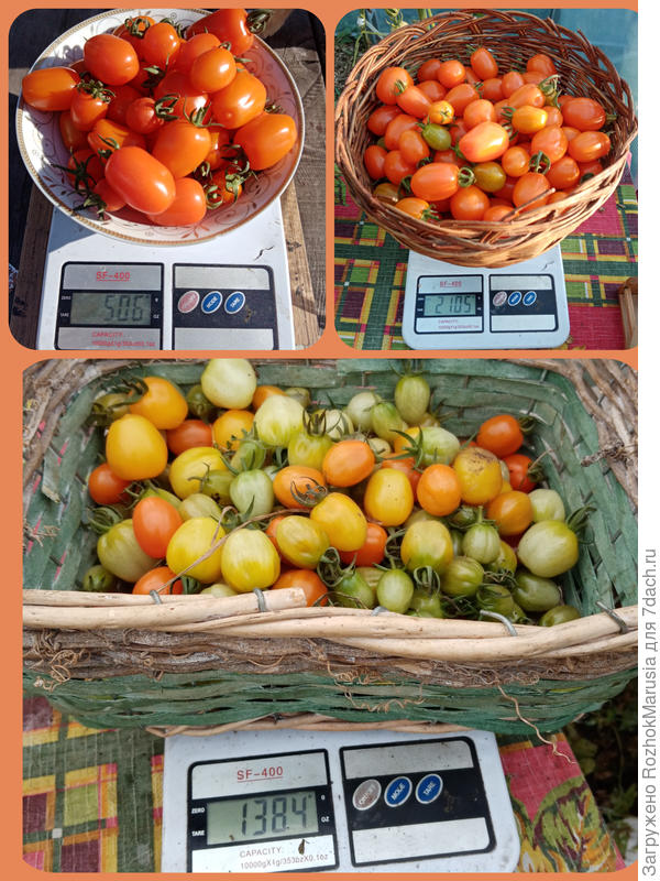 - 3 октября (томаты с кустов жёлтой и оранжевой отчасти осыпались на землю, поэтому собрала их вместе, а третий урожай делю на два вида для подсчёта урожайности) — 100 шт. — 692 г