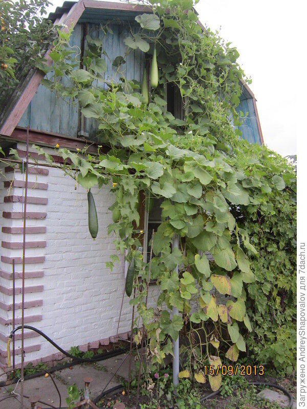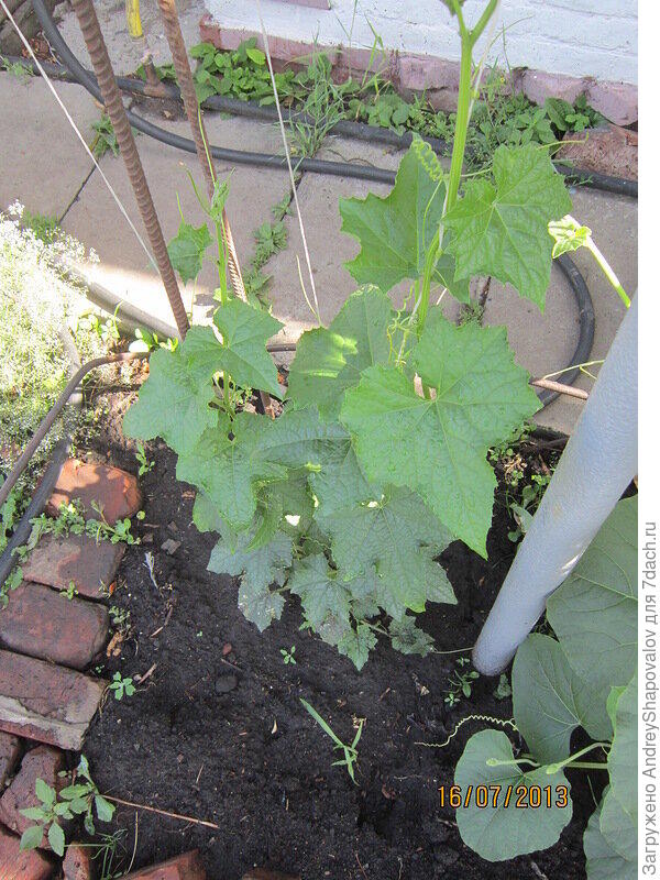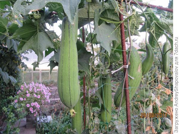 В общем, загорелось мне вырастить этот необычный овощ у себя. В пакетике купленных семян оказалось пять зёрнышек. Сеяла я их в стаканчики на рассаду в конце апреля. Взошли два ростка, которые и пошли на высадку в грунт в начале июня. С высадкой не торопилась — всё таки «экзот», возвратных заморозков боится. Высадила я её в сад к забору, сделала опору из натянутых верёвок. Решила выращивать, в первую очередь, как декоративную лиану. К середине лета моя «лиана» доросла только до середины забора.
