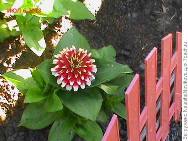 К цинниям отношусь нейтрально, сею их иногда, когда увижу в продаже интересный сорт. Отдельно цветок циннии мне нравится — долго держится на растении, большой выбор расцветок. Но вот в больших посадках она смотрится, на мой взгляд, не очень. Вот для примера: сеяла циннию «Красная шапочка», на пакете с семенами цветы смотрятся очень красочно — все выравнены в сплошной цветущих ковёр, но на деле получаются лохматые, торчащие во все стороны цветоносы с отдельными цветками.