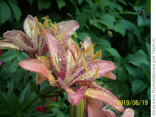 Лилия 'Трайбл Дэнс' действительно лилия-хамелеон! Попробуйте уследить за ее расцветкой! Изучить все многообразие оттенков, собранных в этой лилии! И даже когда вам покажется, что вы насмотрелись на неё и изучили, на следующий день она преподнесёт сюрприз и изменит свою окраску! На ярком солнышке края лепестков выглядят бледно-розовыми...