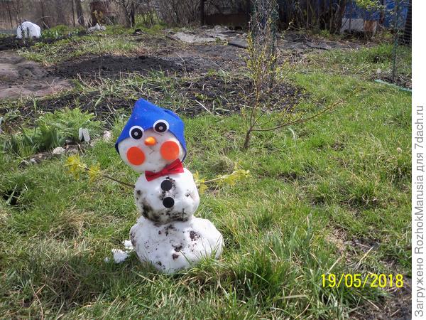 Вот ОН — наш весенний гость!!! Снеговичок! И ручки у него — из зелёных веточек клёна)))