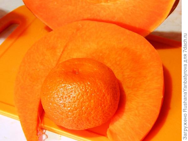 Красиво! Очень оранжевая!!! Выглядит аппетитно! Корочка тонкая и довольно мягкая. Вернемся к описанию сорта:«Мякоть ароматная, сладкая. Рекомендуется для свежевыжатых соков, пюре, тыквенных каш и запекания.» Не сошлось… Ну ничего не сошлось!