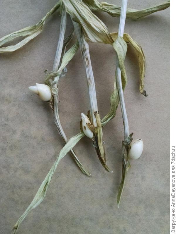 В канун 8 Марта мне подарили букет тюльпанов, я поставила их в вазу с обычной водопроводной водой, без всяких препаратов и добавок. Позже к ним подселилась ветка мимозы. Так и стоял мой весенний букет, радуя глаз и поднимая настроение. Дней через десять тюльпаны завяли, пришло время отправить их в компост. Вытащив из вазы поникшие растения, я глазам не поверила: на стебле одного из тюльпанов в основании листа красовалась молодая белая луковица! И не микроскопическая, а вполне себе крупненькая!