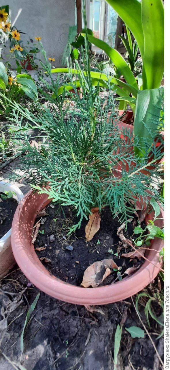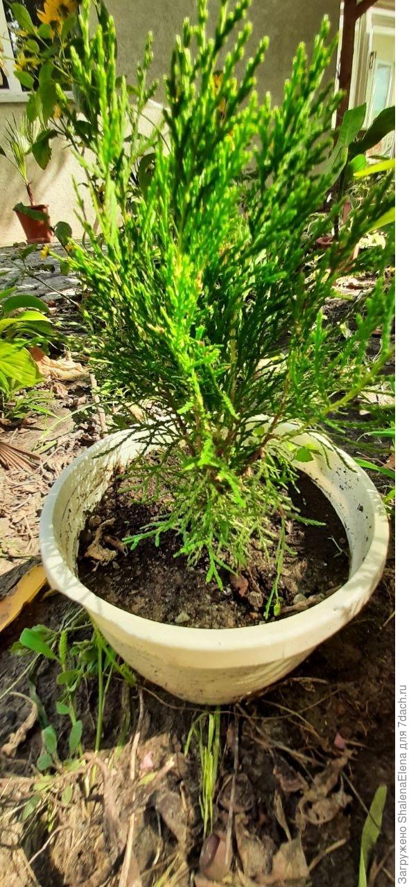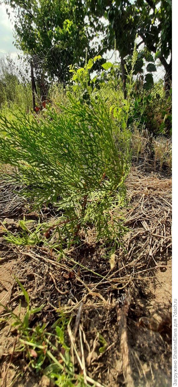 У нас сильное солнце, поэтому туе-детки проводят детство в тени ореха. Тень не сплошная, и ажурные лучики им достаются.