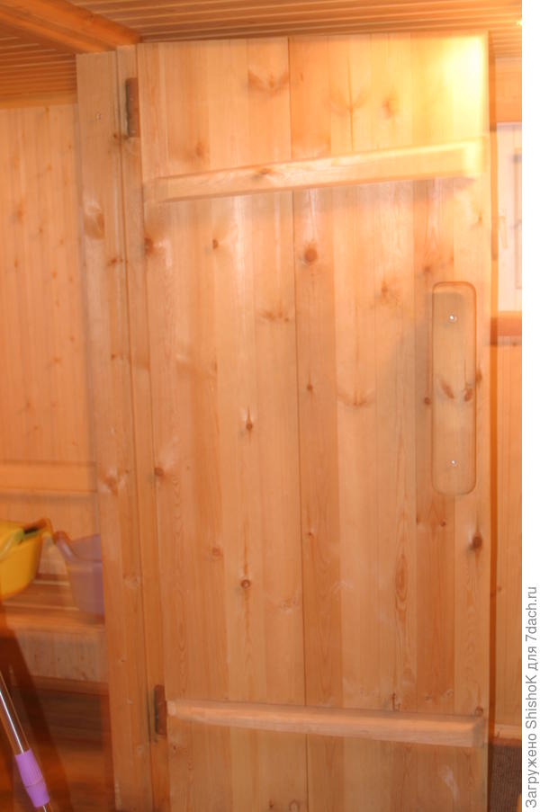 А вот в мыльном отделении тоже возникают проблемы с дверью. Температура и влага приводят к искривлению, рассыханию, самым неожиданным причудливым деформациям. Вот вам пример отличной конструкции двери для влажного помещения.