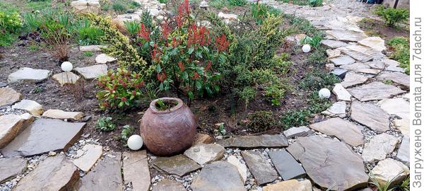 Камни выбирала плоские. Делала под них небольшое углубление в земле и укладывала без всякой подложки. Лежали не сплошным ковром, а через расстояние.