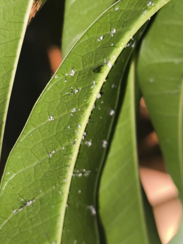 Выручите, пожалуйста! Растению около 6 месяцев. На молодых (только) листьях манго появились чёрные точки и пятна. Температура в помещении +25, восточное окно, цитрусовый грунт с добавлением перлита и вермикулита. Полив раз в 10-14 дней. Вредителей...