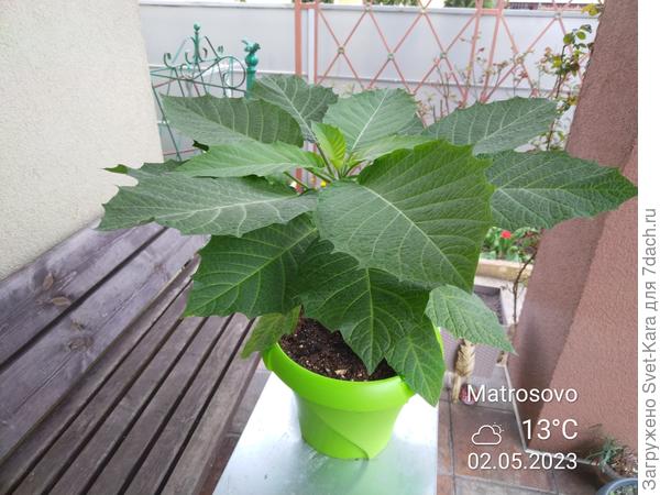 К концу апреля настало время высаживать рассаду перца и помидоров, поэтому бругмансия стала мешать работам в теплице, значит, настало время ее переезда на свежий воздух — на открытую террасу.