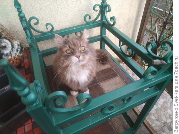 И для неё уже на террасе приготовлена красивая подставка, которая сейчас занята нашей любимой зверюшкой — котиком Лёвочкой. Ну, сиди пока, наша пуховая любимка, скоро это место займет хозяйка — бругмансия.