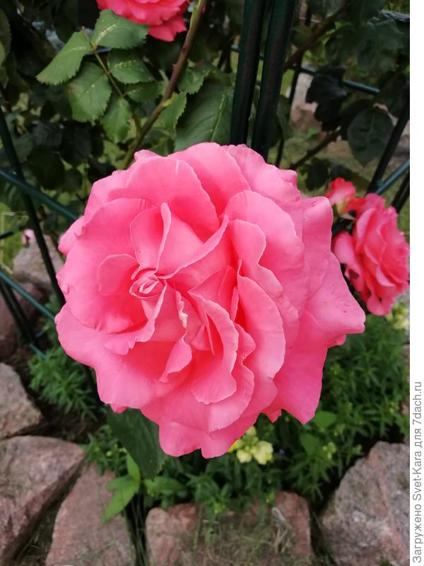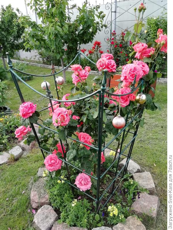 Сезон 2020 года начался для розочки 'Dee Dee Bridgewater' с подарка — муж специально для нее сделал манежик. Теперь она красуется в персональной кованой вазе, которая будет ей надёжной опорой (прочитала на известном «розовом» сайте, что ее высота более 2 м, а ширина больше 1,5 м, и решила подстраховаться).