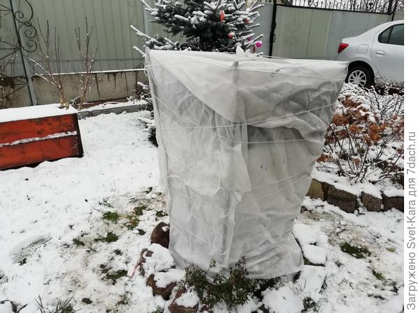 При подготовке к зиме роза была обрезана на высоту манежика (около 1,2 м) и укрыта прямо по решетке спанбондом. Надеюсь, морозы -22°С она переживает без потерь.