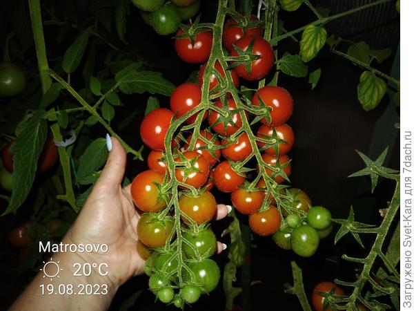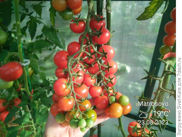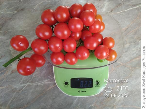 Этот томат был настоящей звездой сезона. Урожайность огромная для таких некрупных помидорок. Посмотрите на самую большую кисть — 822 грамма!!! Хороша!!!