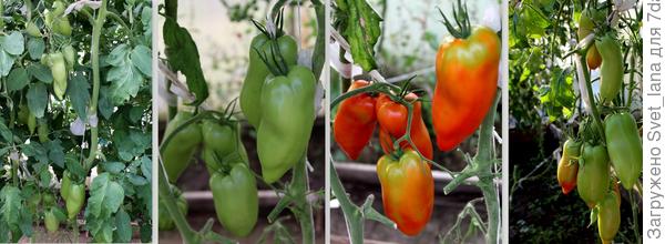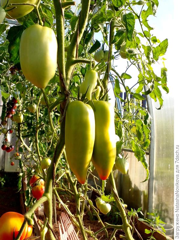 Цена за 4 семечка была внушительной. Взошли все. Сеяла 17 марта, когда другие томаты были уже пикированными. В теплицу высадила в возрасте 40 дней два корешка. Томат быстро догнал соседей и даже притеснил — куст мощный, листья пониклые и очень длинные. Первые завязи среди этой зелени казались маленькими невзрачными сосульками, но как-то незаметно они превратились в большие помидорины, начали зреть и нравиться мне все больше.