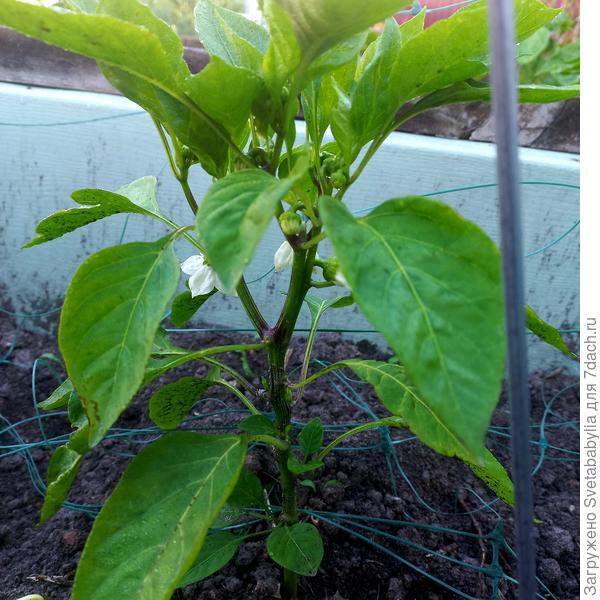 А сейчас то, о чем я писала в начале отчета. Перец практически не растет. При заявленной высоте в 75 см в середине своего жизненного цикла его рост не более 20 см. Он упорно сопротивляется всем моим телодвижениям — рыхлю, поливаю, подкармливаю.