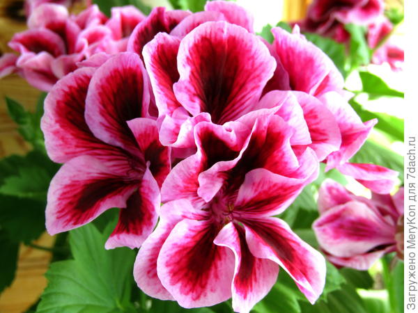 Уверена, что звезды цветов, собранные в крупные шапки соцветий, подружатся в напольных (наземных, в моем случае) кашпо с розовым и белым алиссумом. А путешествовать они будут по всему палисаднику, останавливаясь то возле розария, то у дорожки, а то и в ногах сирени. Листья у этого сорта резной формы, с легкой коричневой полоской. По моим наблюдениям, цветы с такими листьями более терпеливы к температурным колебаниям и к болезням. Но это мое мнение, возможно, и ошибаюсь. Герани прекрасно живут на солнечной стороне, однако великолепно чувствуют себя и в полутени. Растения, размещенные в тени, вытягиваются, и листья у них бледнеют. Но все равно цветут!