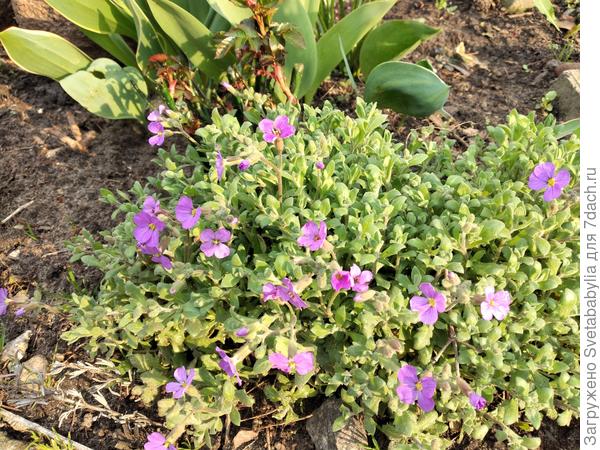Обриета прекрасно зимует под снегом, выходя на солнышко пышными кустиками с мелкими уже зелеными листиками. В зиму она уходит иногда с цветками.