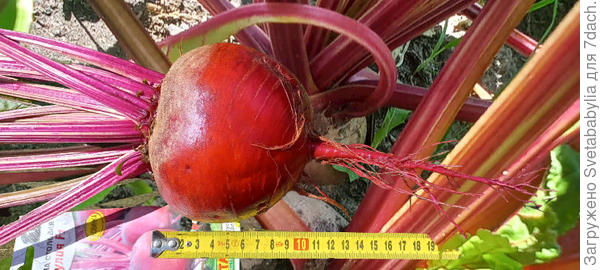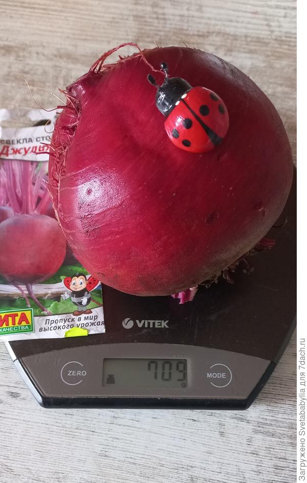 Среднеранний гибрид. Период от всходов до уборки 100-110 дней. Да. На 72 день от всходов был выдернут первый корнеплод. Диаметр составил 38 см, а вес — 707 г. Красотка оказалась весьма корпулентной.