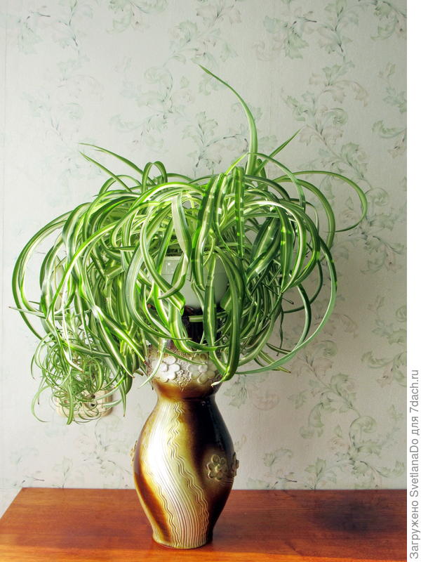 Как я уже писала, нетребовательность хлорофитумов является их очень важным достоинством. Ведь их не обязательно выращивать на окне — на стене комнаты, кухни шикарно и изысканно будут смотреться свисающие кучерявые листья и детки-лианки этого растения. Почему я упомянула кухню, спросите вы? А все очень просто: хлорофитум считается не только красивым, но еще и очень полезным растением. Он очищает воздух от вредных микроорганизмов, поглощает угарный газ и другие вредные примеси.