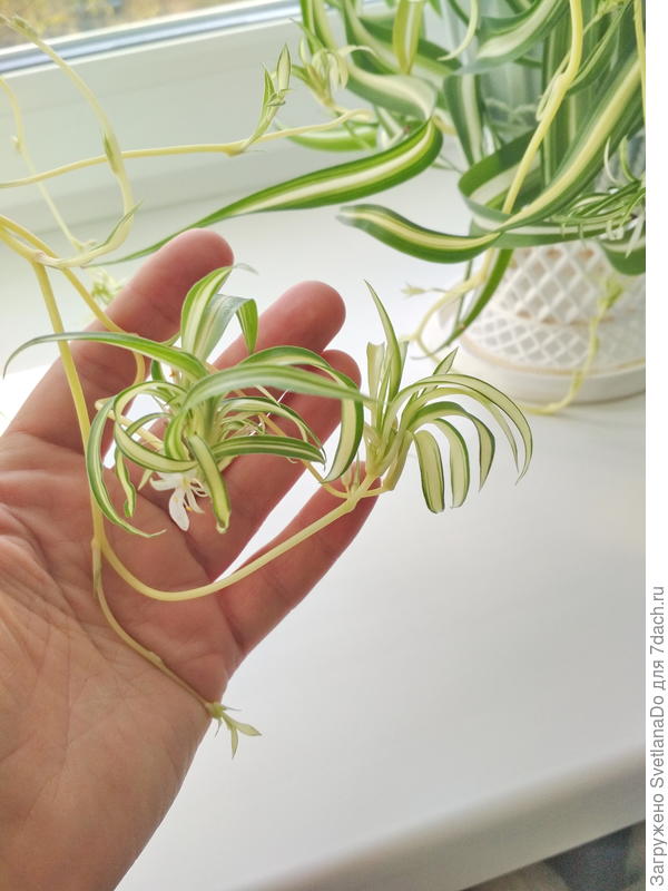 И вот дальше я задумалась: растение очень неприхотливое, поэтому в нескольких словах сказать, что не любит, просто невозможно! Обычно из-за сухости воздуха в квартире кончики листочков у хлорофитумов становятся неприглядными, подсыхают и темнеют, что и у моих растений наблюдается. Именно поэтому необходимо опрыскивать цветок из пульверизатора, обеспечивая достаточную влажность и комфорт. Не любит сильных сквозняков, мне кажется. Частые пересадки тоже не очень нравятся, ведь листочки тонкие, нежные, длинные, они огибают горшок, и нижние при пересадке будут травмированы. К свету хлорофитум очень нетребователен: прекрасно растет в полутени, солнышко уважает, но на очень яркое и палящее солнце я бы не стала выставлять растение, обязательно появятся ожоги.
