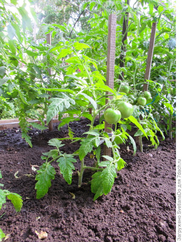 Света, вот такие нынче «Клуши», не как обычно, странноватые, может погода влияла — дожди сплошные, поэтому в ОГ помидоры жиденькие, обычно ствол толстенный, не подвязывала раньше. На первых фото на грядке (грядка высокая), тут уже с помидорками.