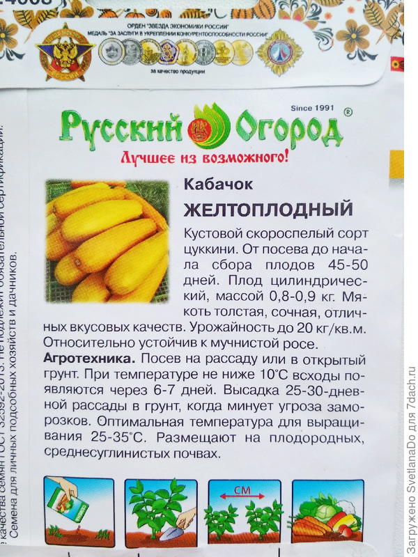 Сегодня хочу познакомить с одним из представителей кустовых — с кабачком Желтоплодным от «Русского огорода». Это скороспелый сорт цукини, от начала посева до сбора около 50 дней.