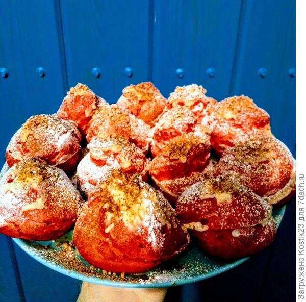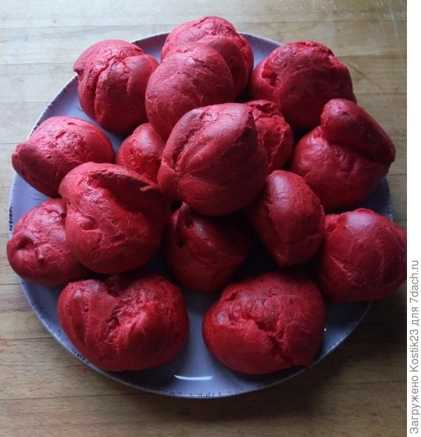 Профитроли «Красный бархат-Red Velvet» с двойным кремом — с шоколадным заварным кремом и кремом чиз, нотками ванили, сверху облиты кремом из белого шоколада и присыпкой «Пралине» из орехово-апельсиновой карамели и какао с сахарной пудрой…