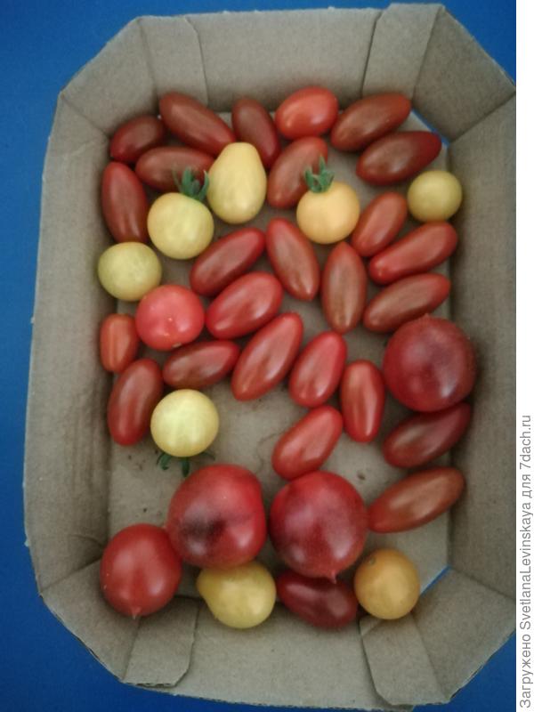 Здесь в основном «сливки» с магазинного черрика. Жёлтые — Синички и Капли, тёмные — Дракончики. Через два-четыре дня вот такое баловство снимали. Жаль, что недолго. Холода наступили( Много кистей зелёными пришлось убрать