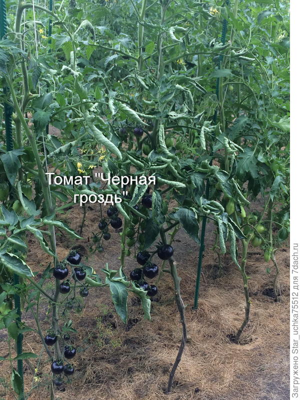 Один из сортов, который меня удивил вкусом, это тоже невысокий томат 'Тёмная галактика' — 1,5 м. Вкус сладкий с интересным привкусом. Детям нравился. Свои томаты я стараюсь выращивать в два стебля. Но, приезжая на дачу не чаще двух раз в неделю, уследить сложно. Этот сорт буду повторять.