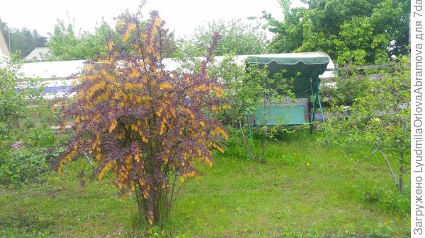 Фото правда делаю с чердака, пока не буду ради этого спускаться, очень уж устал что-то. Надо отдохнуть )) Ну в общем там такой "диван" качающийся, на трубах-балках. Штука кстати надежная, я на него как-то ложился и качался — мою тушку (а вешу я 150 кг наверное) выдерживает вообще без напряга. Вообще-то это площадка из плитки, но там одуваны лезут — навести там порядок в списке моих несрочных дел. Как руки дойдут — займусь )) И фонтан надо будет налить и включить. Пока так. Не хочу наливать фонтан, потому что его надо чем-нить декоративным огородить, а то там собака воду вечно пьёт. Ставлю ему чистое ведро на улице со свежей водой. а он хлещет из фонтана почему-то. Сзади вдоль гаража (это гараж) грядочка, там сплошь золотые шары и немного дельфиниумов, а вдоль забора грядочка — там белые шиповники.